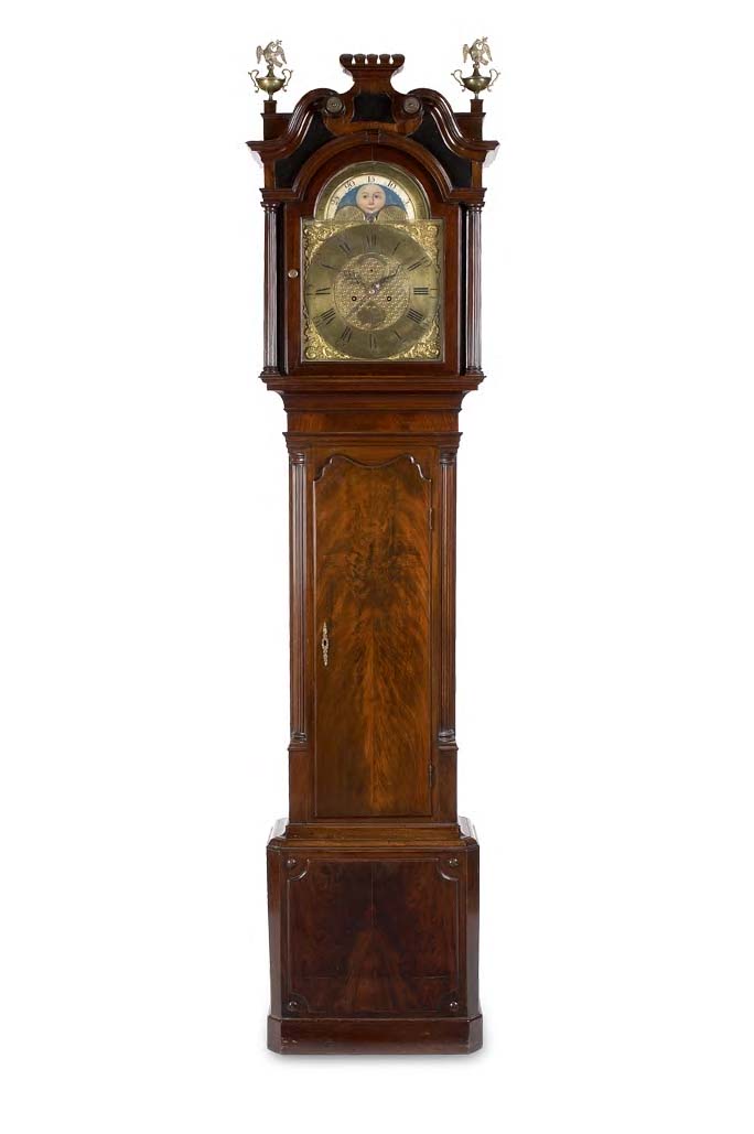 the twin train movement with anchor escapement, the arched brass dial with Roman chapters enclosing subsidiary seconds dial and with moonphase to the arch, further inscribed 'The man is yet unborn who duly weighs an hour', the hood with swan neck pediment and brass eagle finials above reeded columns, the trunk with shaped door enclosing fluted quarter columns on a panelled base