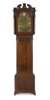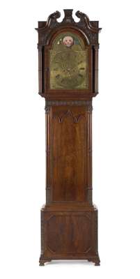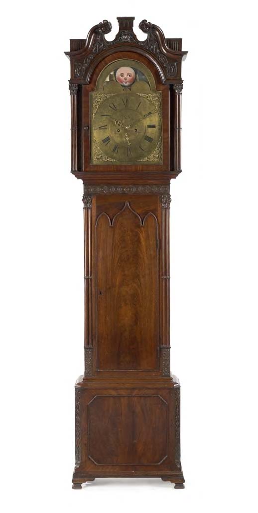 the twin train movement with anchor escapement, the arched brass dial with Roman chapters and subsidiary seconds and date dials with moonphase to the arch, the wood with elaborately carved swan neck pediment above cluster columns, the trunk with ogee arched door on panelled base with ogee bracket feet