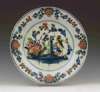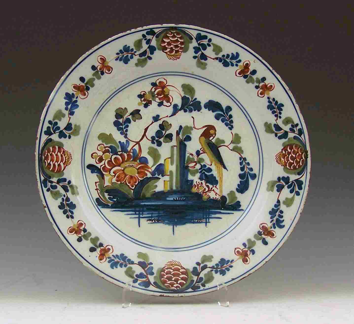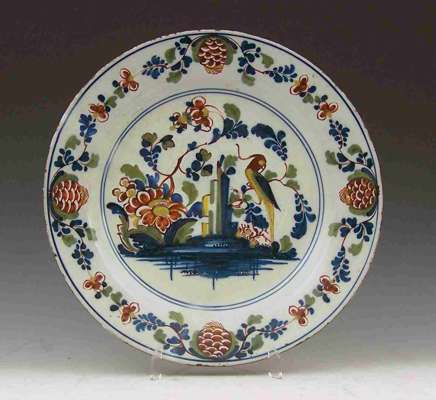 with pine cones and foliage to the border, the well decorated with a parrot on a branch in a rocky landscape with bold flowers