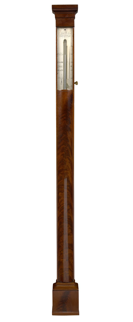 the moulded and projecting cornice above rectangular steel and glazed scales above a bowed trunk with square reservoir cover below
