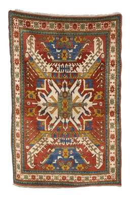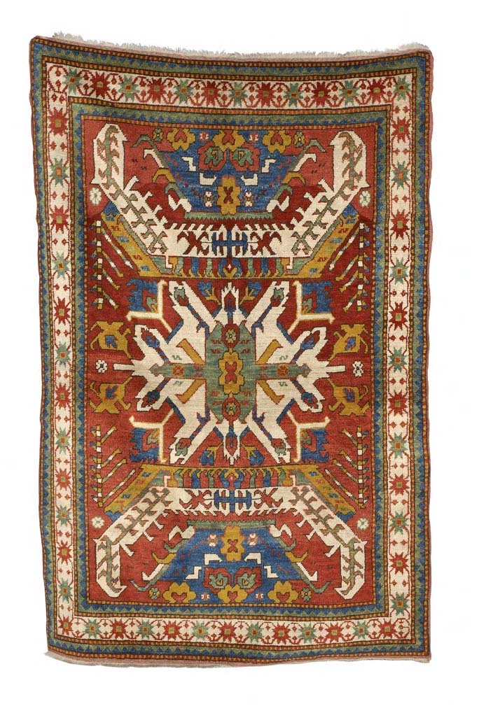 the red field with central ivory and green medallion flanked by ivory bars and blue medallions, within ivory star and vine border between pyramid bands