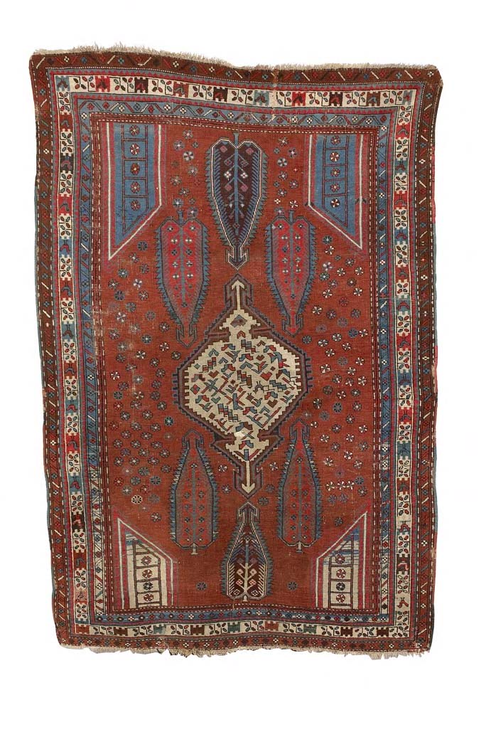 the rust red field with central ivory medallion suspending arrowheads, flanked on each side by three polychrome cypress trees, blue and ivory angular spandrels, within ivory foliate and bird panel border between blue and brown bands