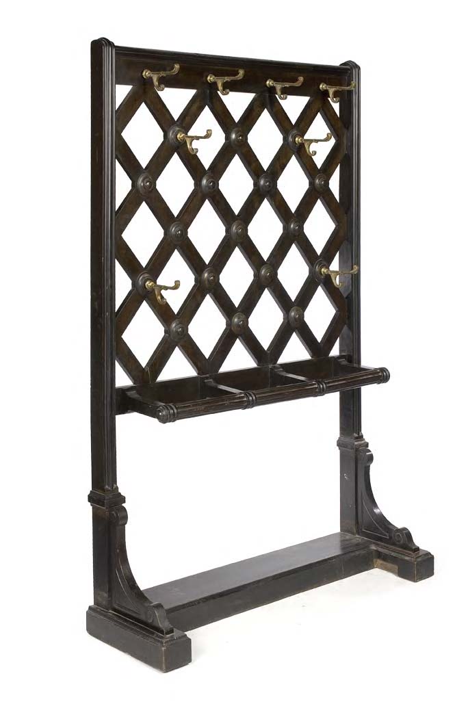 the latticed back with turned bosses and applied gilt brass coat hooks above a fluted support for sticks on square supports linked by a stretcher