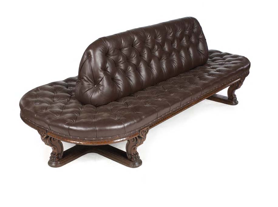 the brown leather button upholstered seat of rounded rectangular form with central removable back rest, above lappet-carved seat rail and raised on scroll supports with lion's paw feet, the whole resting on platform stretchers