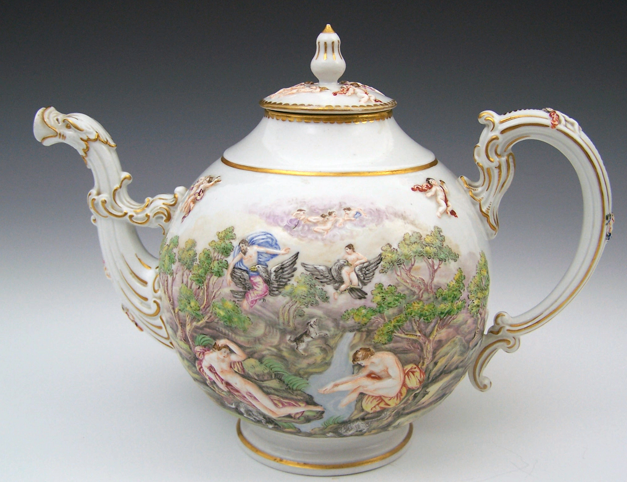 of globular form, the cover decorated with relief putti, the body decorated to each side with classical landscape scene depicting nude women bathing, the scrolling handle and dragon form spout highlighted in gilt