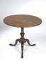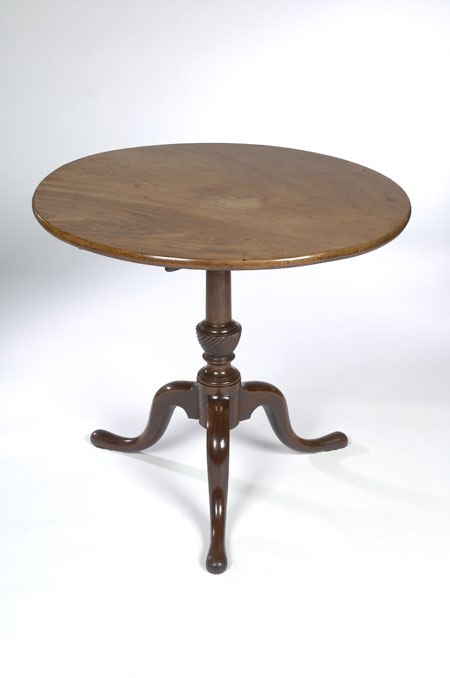 the circular tilt top above turned stem with fluted detail on three swept legs on flared pad feet circa 1750