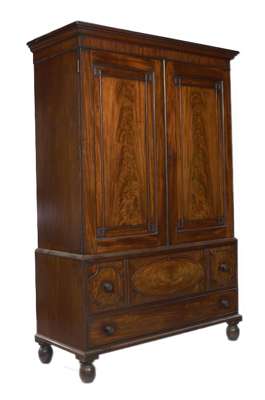 in the manner of Gillows, the moulded and projecting cornice above two panelled doors with beaded mouldings enclosing hanging space (formerly with sliding shelves), the base with two long graduated drawers raised on turned feet