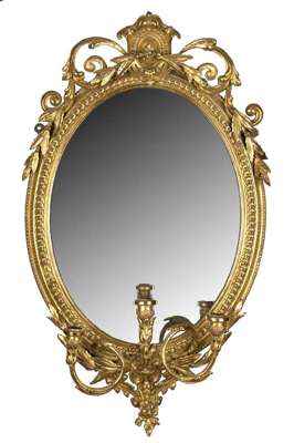 each with oval plates enclosed by beaded and moulded frames above applied foliate decoration with three scrolling branches, the whole with elaborate corresponding foliate cresting (2)