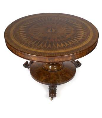 the circular top profusely inlaid with radiating bands of parquetry inlay, further enhanced with chevron and dentil inlaid banding to the edge, the base with maple-inlaid tapering column on circular platform with leaf carved scroll toes