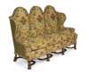 In the William and Mary taste, the back with projecting wings and scrollover arms above an undulating serpentine seat rail on four short melon-turned and gadrooned legs united by serpentine cross stretchers with central boss finials, on braganza feet, the whole traditionally upholstered with Jacobean-style floral tapestry with taselled fringes