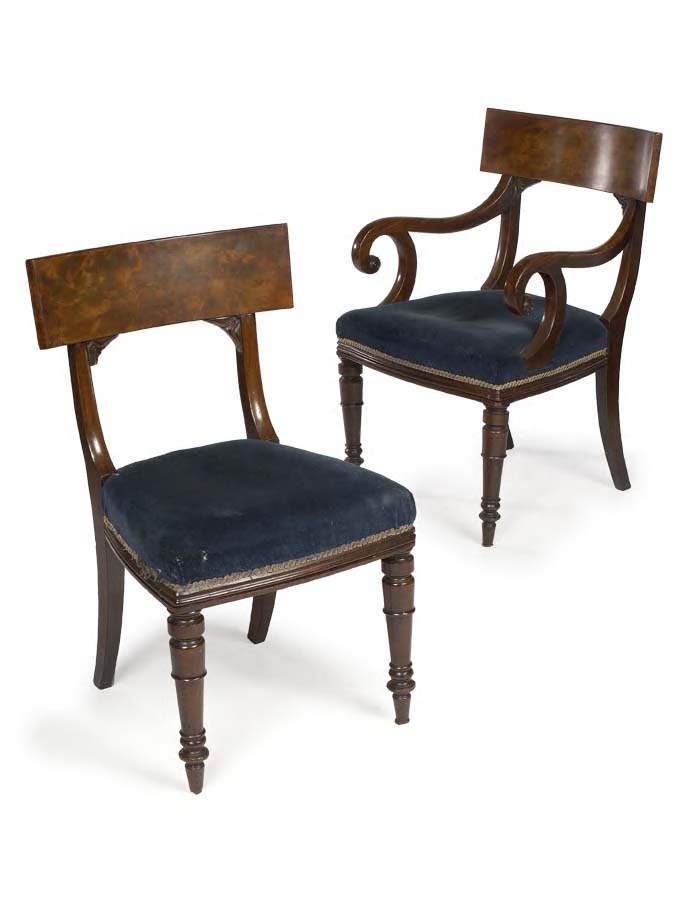 including two carvers, each with broad curved upright top rails and curved supports above stuffover seats on turned and tapering front legs and with sabre legs to the rear (12)