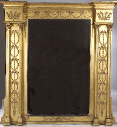 the rectangular bevelled plate enclosed by twin fluted pillars and ribbon tied husk swags and pendants below a moulded reverse breakfront cornice
