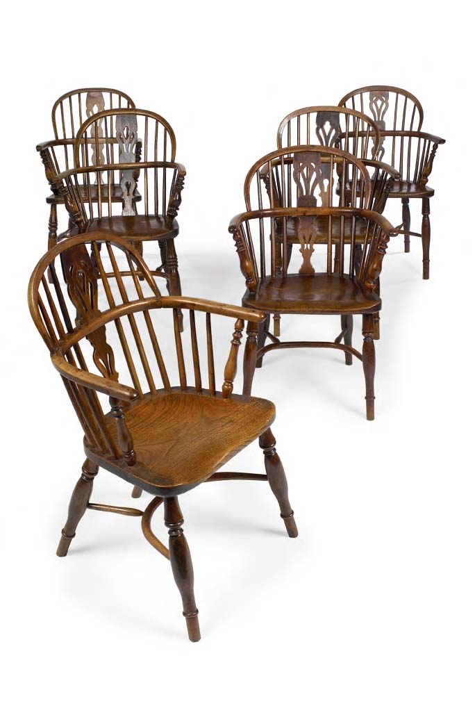 three made in elm and three combining yew and elm, each with curved spindle-filled backs and arms, with pierced splats above moulded solid seats, on turned and tapering legs linked by hoop stretchers (6)