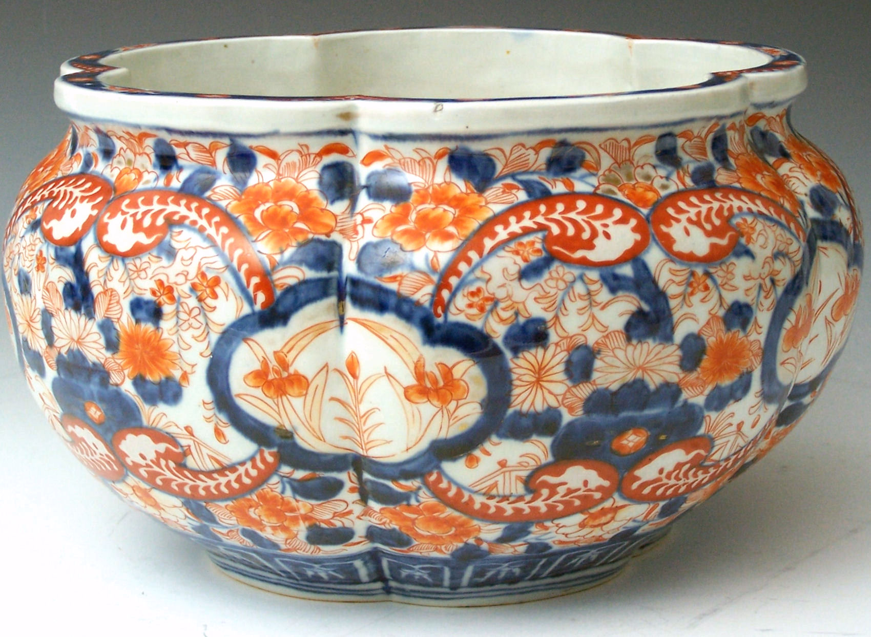 of circular lobed form, profusely decorated with scrolls and panels, containing flowers in vases, surrounded by further flowerheads