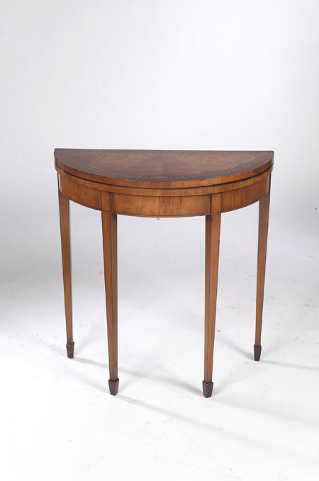 the demi lune top with radiating veneers, crossbanded in mahogany and inlaid with meandering foliate and floral inlay, above a plain frieze, raised on square tapering legs with spade feet