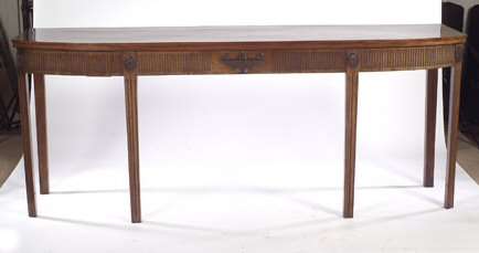 the semi-bowed rectangular top above a fluted frieze with central applied urn carving and rosette spacers, the whole raised on moulded square legs