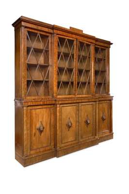 the stepped and moulded cornice above four trellis astragal glazed doors enclosing shelves, the base with four panelled cupboard doors centred by boldly carved lion masks, the whole divided by plain pilaster uprights on plinth base