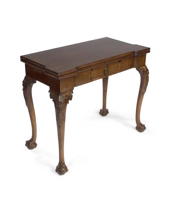 the re-entrant top enclosing a baize lined interior with counter wells above an inswept frieze with central drawer, on cabriole legs carved with acanthus leaves and terminating on claw and ball feet