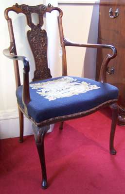 with well carved vase shaped back splat, above a needlework upholstered seat enclosing curved open arms and raised on carved cabriole legs