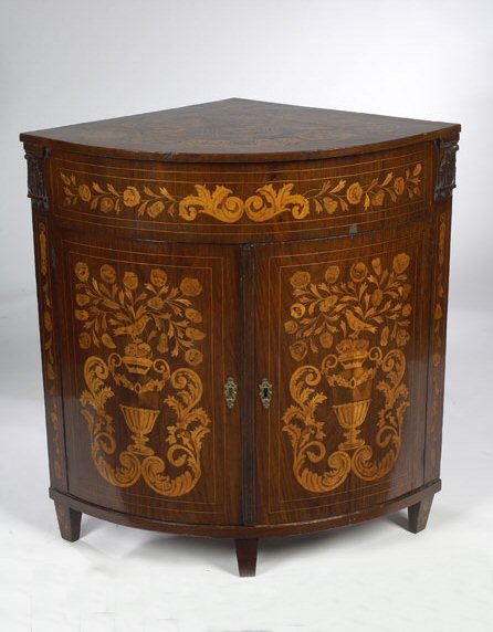 A late 18th century Dutch walnut and floral marquetry bowfront corner cupboard