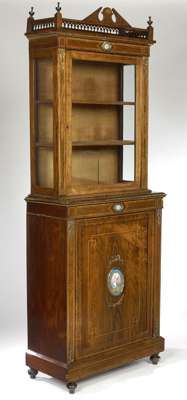 glazed top over blind door base decorated with geometric boxwood inlay, gilt metal mounts and Sevres-style panels, adapted