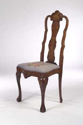 the scalloped top rail above vase-shaped splat and shaped uprights above drop in seat and cabriole front legs, the whole profusely decorated with foliage