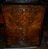 the moulded top with a sunken field frieze drawer carved with scrolling anthemia, the oval panelled fall enclosing a fitted interior of short and long drawers around a central maple crossbanded cupboard door, the lower part with two long drawers, the whole of tapering form, on moulded block feet