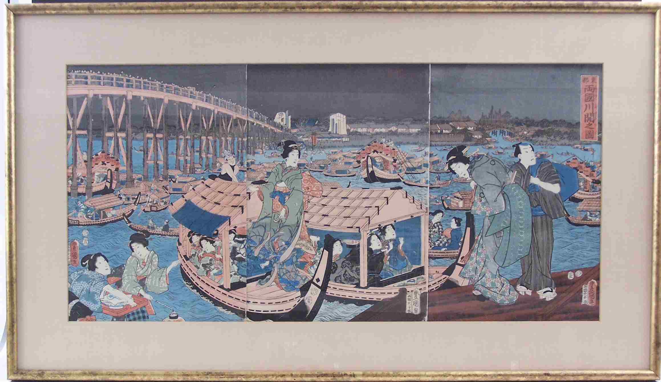 'Fireworks over the River at Ryogoku', depicting bijins on boats in the foreground with two figures on a jetty, later framed