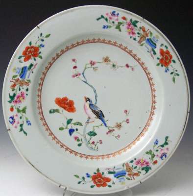 the border with three panels of flowers, a vase, scroll and ceremonial vessel, the well with spearhead border, decorated with an exotic bird sitting on a branch with prunus blossom and a large peony