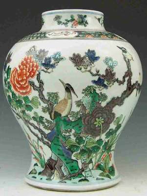 of baluster form, decorated with flowers to the neck, a band of geometric pattern with panels containing good luck symbols, above the body boldly decorated with birds in flowering foliage