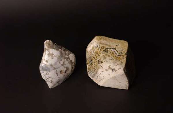 from Madagascar, comprising: two freeform polished chunks, displaying the small spherical (botryoidal) formation unique to Orbicular Jasper, both approximately 19cm high; and a set of three Orbicular Jasper spheres (5)