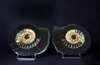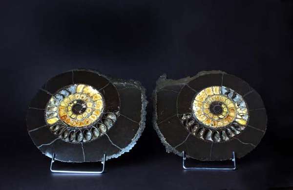 A pair of cut and polished pyrite Ammonites