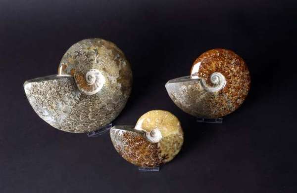 from Madagascar, all from the Jurassic period (160 million years old), comprising: three polished Ammonites, species Parkensonia 23cm, 18cm and 14cm across; three Ammonites, species Perisphinctus, 18cm, 15cm and 12cm; and a cut and polished Ammonite pair, one large single Ammonite (sliced in half to show the interior chambers of the shell structure), 28cm across (8)