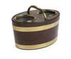 of oval form, with brass loop handle and two brass rimmed apertures for bottles, above a staved body