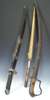 with wooden grip, stirrup hilt and pommel backstrap, single edged curved blade with fire blued ricasso decorated with gilded trophies, with original steel scabbard; an oriental sword with heavy single edged blade and round hand guard, the grip of interlaced black cord, in a black leather scabbard; and a South East Asian Parang with single edge blade in a split bamboo scabbard (3)