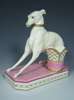 the white greyhound with gilt collar, sitting back on its haunches with forelegs extended, beside a basket, on a rectangular pink plinth with canted corners