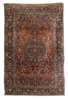 the red field with central elongated indigo medallion with red cruciform centre, suspending pendants, similar spandrels, within indigo palmette, rosette and scrolling vine border between ochre bands