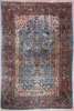 the indigo field with central vase issuing floral sprays, flanked by cypress trees, rose mihrab, within claret bird and floral tree border between brown ribbon bands