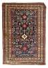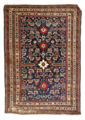 the indigo ground with pattern of ram's heads, stylised birds and rosettes, within multiple cream and brown borders with outer skittle band