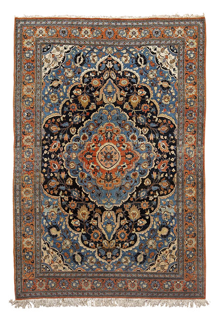 the indigo field with brick red and blue medallion suspending pendants, blue and ivory spandrels, within brick red palmette and scrolling vine border between blue bands