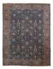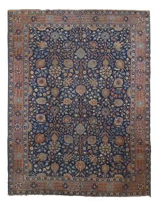 the indigo field with allover palmettes, rosettes and floral vine pattern, within a brick red rosette, palmette and floral vine border between ivory bands