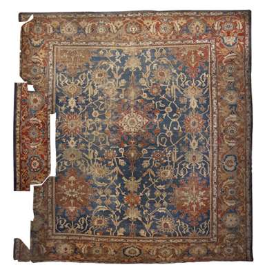 the indigo field with allover large brick red rosette and palmette vine pattern, within brick red turtle palmette, rosette and vine border between ivory bands (worn and cut)