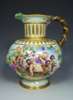 of baluster form with branch form handle, decorated to the neck with reeded and stiff leaf decoration, and to the body with opposed panels, one Bacchanalian, the other still life, framed by polychrome grapes and vine leaves, on a spreading foot, gilt painted mark
