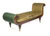 the overscrolled back boldly carved with acanthus above stuffover seat and inscrolling end rail with carved rosettes, the sunken field seat rail with anthemion capitals on short reeded tapering legs ending in engine turned brass socket castors