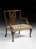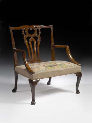in the form of an oversize open armchair, the yoke shaped top rail above pierced and scroll carved splat and downswept arms, the floral petit point needlework stuffover seat (of a later date) decorated with birds perched in a tree, on cabriole legs with pad feet
