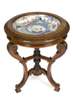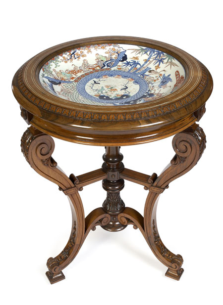 the circular top with ivory lines and lappet-carved edge mounted with a large Japanese Imari charger decorated with a pagoda and courtly figures at leisurely pursuits, the cavetto frieze applied with rosettes above three acanthus carved and moulded scrolling legs decorated with bell flowers at the ankle, on moulded block feet united by cross stretchers and a central turned and leaf carved boss