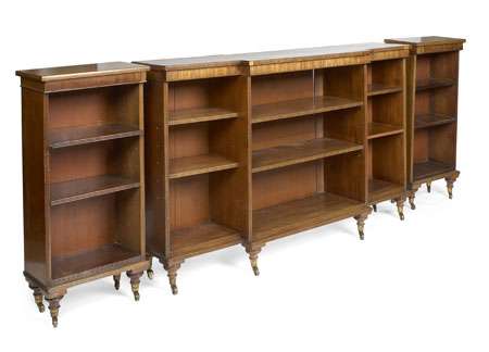 the plain frieze above three bays of reeded open shelves, on short turned legs with brass socket castors (the sides pierced for additional alcove shelf supports), 156cm wide, 97cm high, 35cm deep; together with two smaller matching free-standing open bookcases, en suite, each 46cm wide, 97cm high, 24cm deep (3)