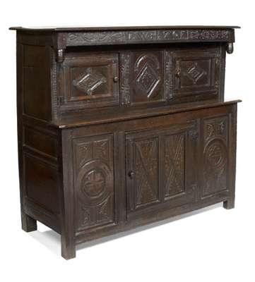 the frieze carved with the initials 'T.W.' and dated 1705, above turned pendants and a pair of panelled cupboard doors decorated with lozenges, the lower part with panels of foliage and central door, on channel moulded stem feet, with later top planks and back panels, some carving of a later date