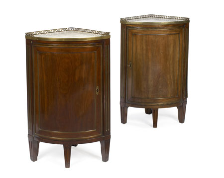 A pair of French Directoire period mahogany and brass mounted bowfront encoignures