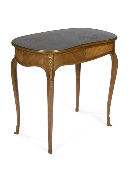the top of kidney-shaped form with gilt-tooled skiver above a shaped frieze with full length drawer, on cabriole legs headed by flowerhead and berry mounts and ending in scroll-cast sabots